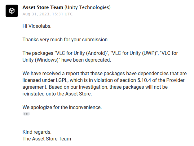 Developer Martin Finkel has recently published a blogpost illustrating his attempt to distribute a binary of “VLC for Unity”, an integration that allows building media players based on VLC in Unity-based games. This attempt was initially successful, but Unity has removed the project from its store through the above e-mail. Unity has since made it clear that they wouldn’t allow VLC back even if they removed all LGPL parts.