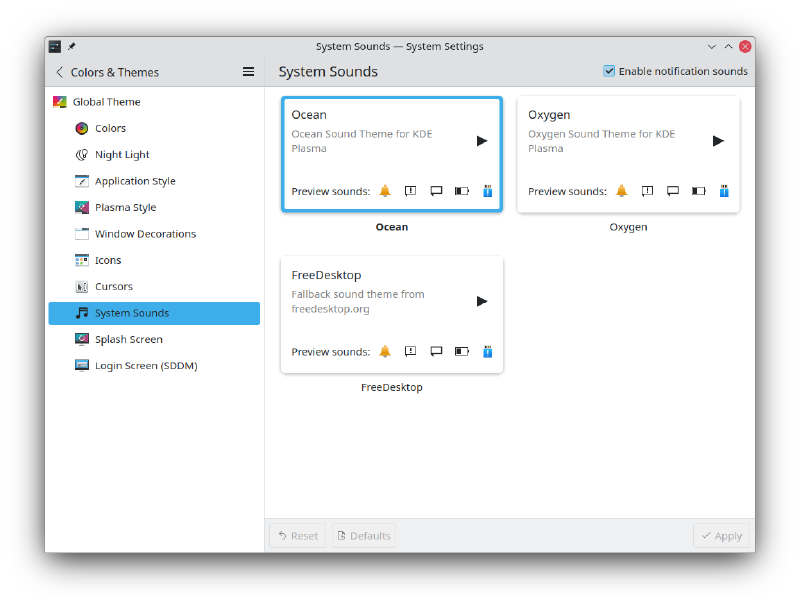 There’s also a completely new Setting page (after all, we’re KDE, we can’t release a major version without a new setting page). It’s called “System Sounds” and it allows you to switch between the included sound themes; we’ve even designed a new one from scratch, called “Ocean”, to replace Oxygen.