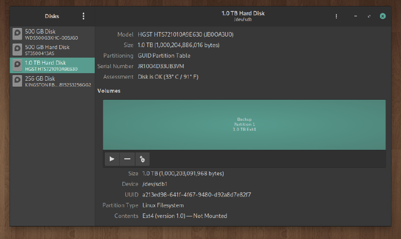 To do this through a program, you can open the ‘Disks’ utility and identify the drive. You’ll want to find the Device, UUID, and the type of file system. For example, I will be mounting my backup drive.