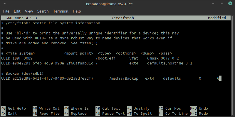 UUID=a213ed98-641f-4f67-9480-d92a8d7e82f7 /media/Backup ext4 defaults 0 0