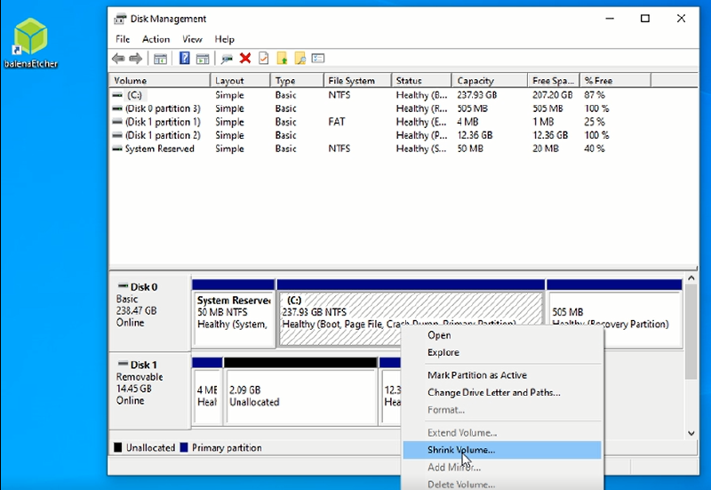 Right click on your main boot partition that holds your Windows 10 operating system. Click on ‘Shrink Volume’