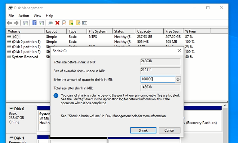 Click on ‘Shrink’ and you’ll see the the new Unallocated space. This is where we will be installing the new Linux distro.