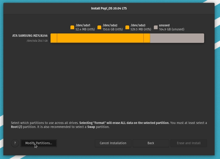 From the custom installation menu, you should be able to see a preview of the partitions on the system, including the space you freed up. This will be called “unused” space. Click on ‘Modify Partitions…’ near the bottom.