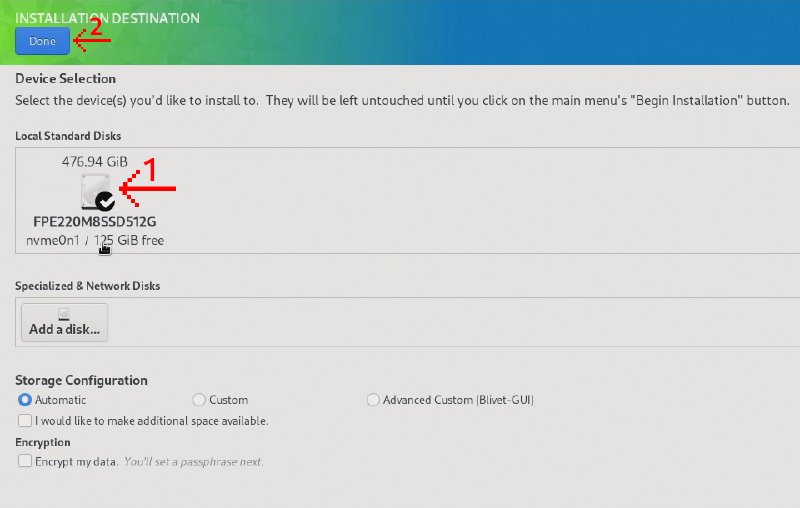 Next, select the disk you want to install Linux on, then click Done on the top right. This will automatically detect the free space on your disk and install Fedora into it. If you want to double-check, you can set the storage configuration to “Custom,” when you click done, it will prompt partitioning, in which case you can click on “Click here to create them automatically.” Then, you can see what changes Fedora is making to your driving.
