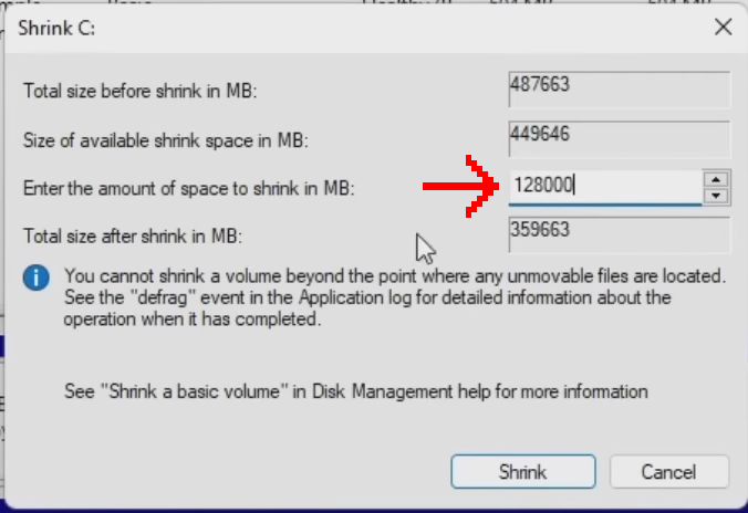 Now enter the amount of space you want to give Linux (in MB) into the “Enter the amount of space to shrink in MB”. Make sure not to shrink it to have less than what Windows currently uses, and make sure that Windows has at least some free space left (maybe 30-40 GB or so) to give Windows some leeway after the dual boot. Do note that 1000 MB is equal to 1 GB.