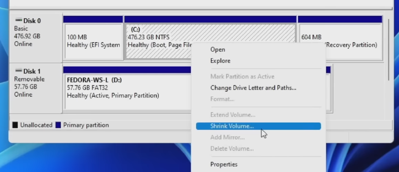 Next, we will figure out which drive we want to resize. It is most likely going to be Disk 0, but make sure to double-check if you have multiple drives. Next, we are going to right-click the C drive (or whatever drive Windows is on) and shrink the partition to make room for a Linux partition. To do that, right-click your C: partition and go to shrink volume.