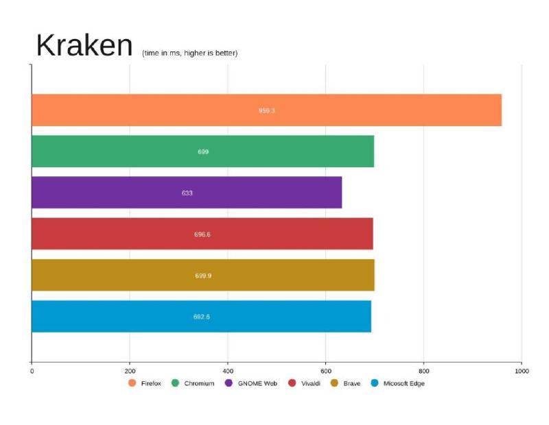 Javascript Testing Kraken JavaScript Benchmark (time, lower is better) Firefox: 959.3ms ±1.2% Chromium: 699.0ms ±0.6% GNOME Web: 633.0ms ±0.7% Vivaldi: 696.6ms ±0.5% Brave: 699.9ms ±0.8% Edge: 692.6ms ±0.6%