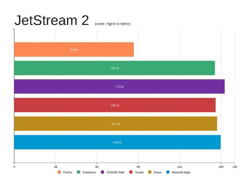 JetStream 2 (score, higher is better) Firefox: 86.848 Chromium: 145.737 GNOME Web: 152.809 Vivaldi: 146.212 Brave: 147.310 Edge: 149.908