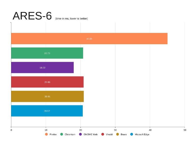 ARES-6 (time, lower is better) Firefox: 45.05ms ±1.45 Chromium: 20.73 ±0.92ms GNOME Web: 18.02 ±1.42ms Vivaldi: 20.86 ±1.18ms Brave: 20.91 ±1.03ms Edge: 20.62 ±0.82ms