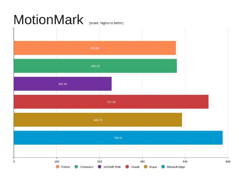 Graphics Testing MotionMark (score, higher is better) Firefox: 605.66 ±3.77% Chromium: 609.23 ±11.19% GNOME Web: 365.45 ±4.88% Vivaldi: 727.09 ±7.52% Brave: 628.79 ±17.35% Edge: 780.51 ±12.10%