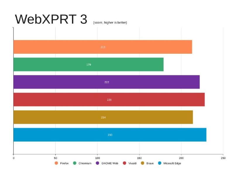 Generalized Testing WebXPRT 3 (score, higher is better) Firefox: 213 Chromium: 179 GNOME Web: 222 Vivaldi: 228 Brave: 214 Edge: 230