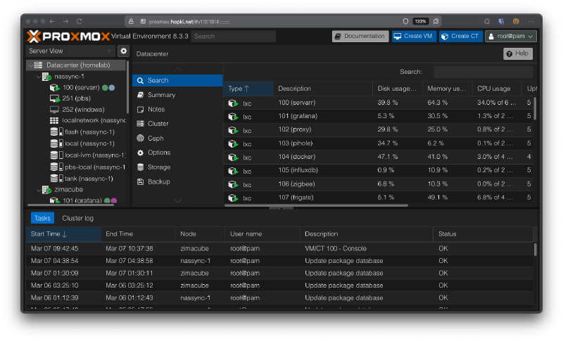 The first node is running on a ZimaCube is this responsible for all my media servers and management. Additionally it has a windows virtual machine that I can spin up when needed. The second node is virtually everything else running on a single LXC with docker or running independently from a community installation script. I hope in the future to build my own server as to rid my use of desktop NAS systems, granted they have been great thus far.