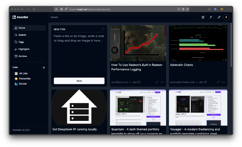 My video covering Hoarder may have turned into a unfortunate story of drama, that’s not to take away from how awesome this tool actually is. I think of it as a dumping ground for anything I come across that is slightly interesting. This is a self-hostable bookmark-everything app with a touch of AI for the data hoarders out there. Some of the features include the ability to take simple notes and store images and pdfs, automatic fetching for link titles, descriptions and images, sorting tools, and full text search of all the content stored.