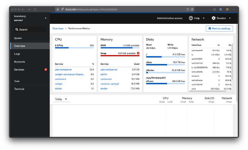 I was using this in a centralized LXC for managing shares and using various extensions to give cockpit even more features. After a very resent change in my home server setup I yet to install it on anything, but I’m leaving it here on this list as it is an amazing tool.
