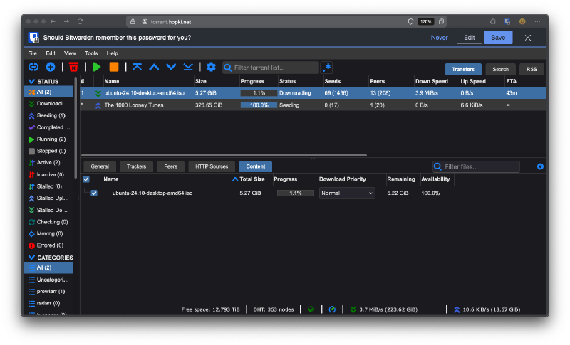 This is a web version of the popular qBittorrent peer-to-peer file sharing client. Overall its clean, simple, and has a fair bit of features. Works well with AirVPN (my favorite VPN service) and integrates well with various *arr applications.