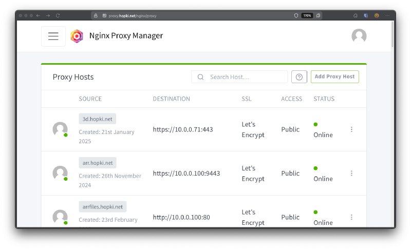 NGINX Proxy Manager is a simple web based proxy manager for setting up and forwarding domain names to your services and generating SSL certifications. I use this for both local top level domains and exposing a few select services to the public internet.