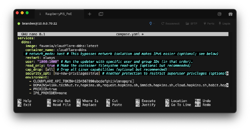 This is a very simple docker container used to update your public IP address within the Cloudflare A records using their API. I need to use this becuase my public IP is dynamic, meaning it will randomly and automatically change every few weeks or sometimes every few days. From their Github it’s; “A feature-rich and robust Cloudflare DDNS updater with a small footprint. The program will detect your machine’s public IP addresses and update DNS records using the Cloudflare API.”