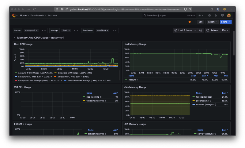 Grafana is a BEAUTIFUL dashboard tool that can translate various databases into stunning graphs, charts, and presentation. There is a huge amount of integrations and custom dashboard that many people create for their specific use cases. You can easily add a connection and import a dashboard to display the data. The most popular is for the Node Exporter that you can see above.