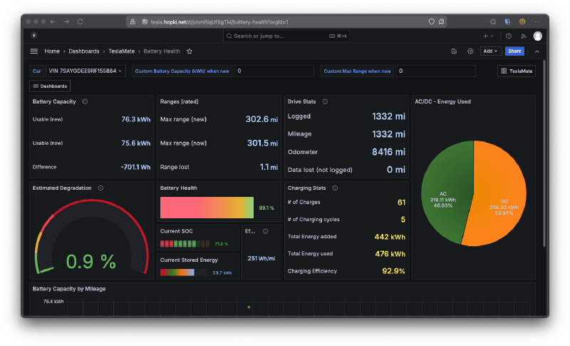 TeslaMate is a tool that uses the Tesla API to gather every possible data point about the car. This includes trips, mileage, battery, elevation, and much more. This is a stack that includes Teslamate itself, a database, Grafana, and a few others.