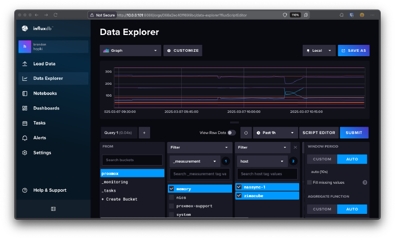 InfluxDB is described as; “Purpose-built database for all types of time series data at any scale.” This database tool has it’s own way to turn data into charts and graphs, but I’m primarily using it for helpful data from my Proxmox server and pulling that data to Grafana dashboards.