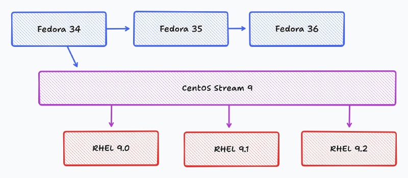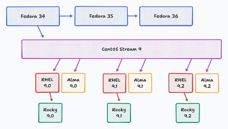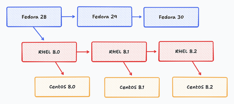 However, in the year or so leading up to the previous RHEL clone video/article, Red Hat moved CentOS upstream. Previously, Fedora would release a version, then RHEL would inherit from Fedora to build a new RHEL release, and subsequently, CentOS would create a rebuild that the community could use.