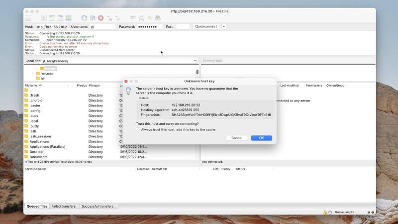 FTP is a way to move files from one computer/server to another. This is what we will use to move ROMS onto our Raspberry Pi. I’m going to be using FileZilla, my favorite FTP application. Open FileZilla; on the top, there will be a place to input your login information. For the host, use ‘sftp://yourIP’, and the default username and password is ‘pi’ followed by ‘raspberry’. If everything was done correctly, the RaspberryPi filesystem will populate after you click connect.