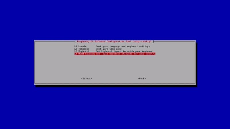 In this menu, select L4 WLAN County, and you will get a huge list of possible options. Select your country. Also note that in some of the menus, there will be a Select and Back option. You will use the up and down arrow keys to highlight the option you want, and then press the right arrow key to highlight Select or Back to continue from there.