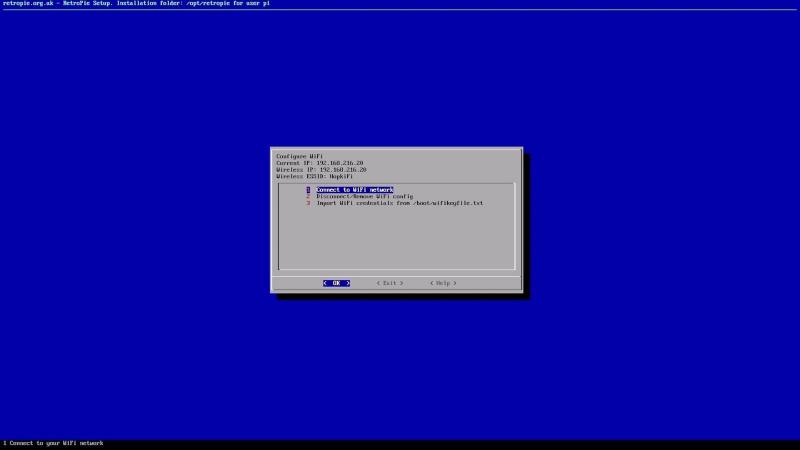 In the Wifi selection menu, this will look very similar to the Raspi-Config menus. Select the first option, and it will scan for Wifi networks. Select yours and input your password. Once connected, you will be able to see your IP address. Write this down as you will need it to load your ROMS.