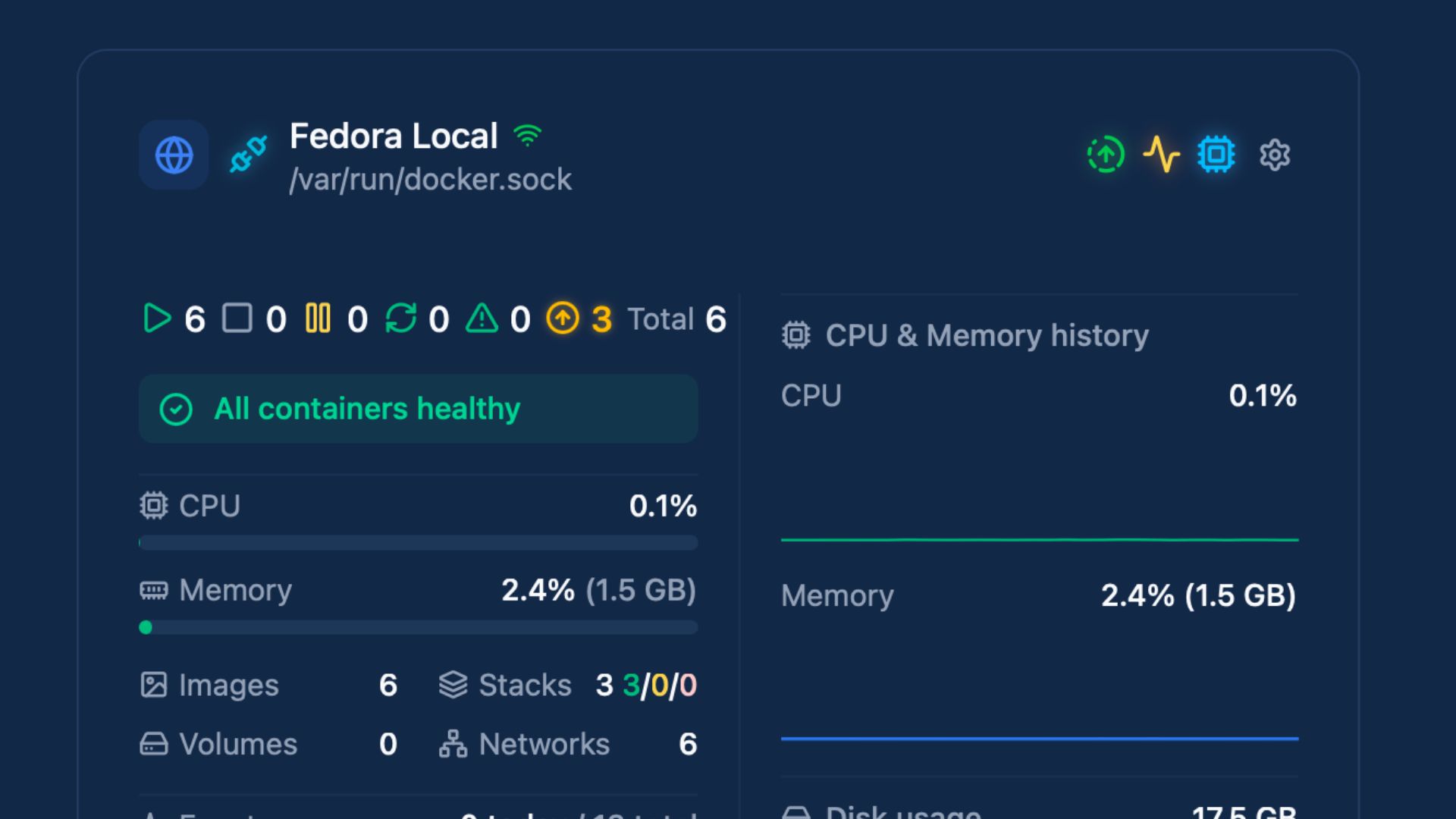 And just like that, the dashboard lights up. I can see my Fedora Local environment with all the running containers. Ollama, Postgres, Open WebUI, ZeroByte, and Dockhand itself.